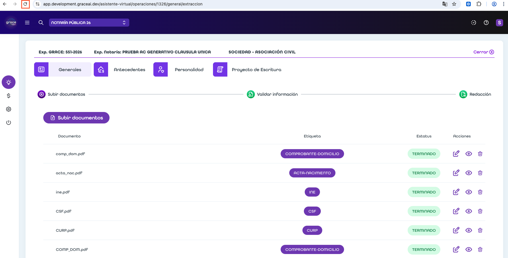 ⦿ A partir de ahora, cuando el usuario se encuentre trabajando dentro de un expediente en el Asistente Notarial, al recargar la página GRACE conservará automáticamente el contexto actual, manteniéndose en el paso en el que estas trabajando.